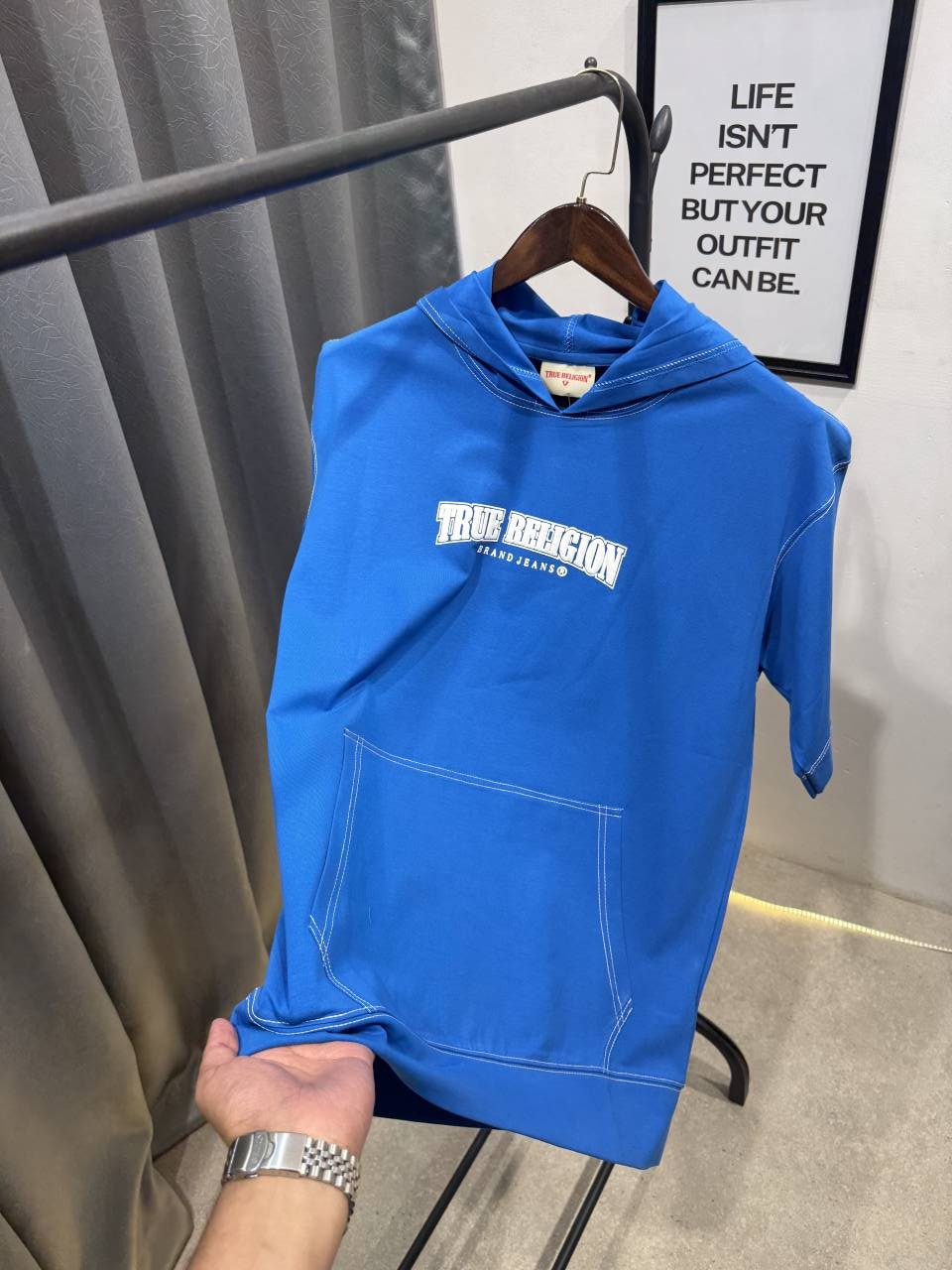 ? *True religion drop shoulder hooded tshirt with front pocket and front back imported brading patches now available in stock*?